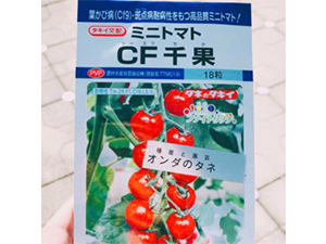 最初のうちは「言ってるだけかな?」と様子を見ていたのですが、前を通るたびに、「私もやりたい!」と言うので、旧国道沿いの「恩田種苗(オンダのタネ)」さんで種を買ってきました。お店の方のおすすめで「CF千果」という品種にしてみました。